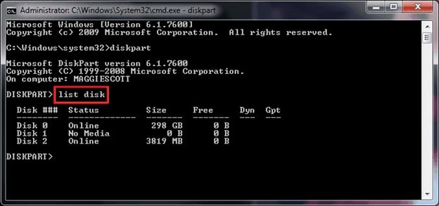 - دستور list disk را تایپ کنید و Enter بزنید تا لیست درایوها نمایش داده شود