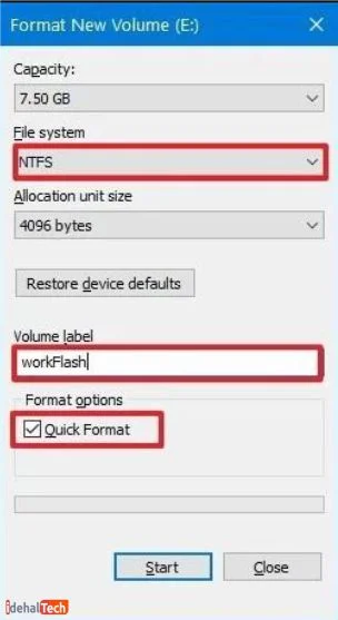 - Volume Label: اگر میخواهید، میتوانید یک نام برای فلش مموری خود انتخاب کنید.